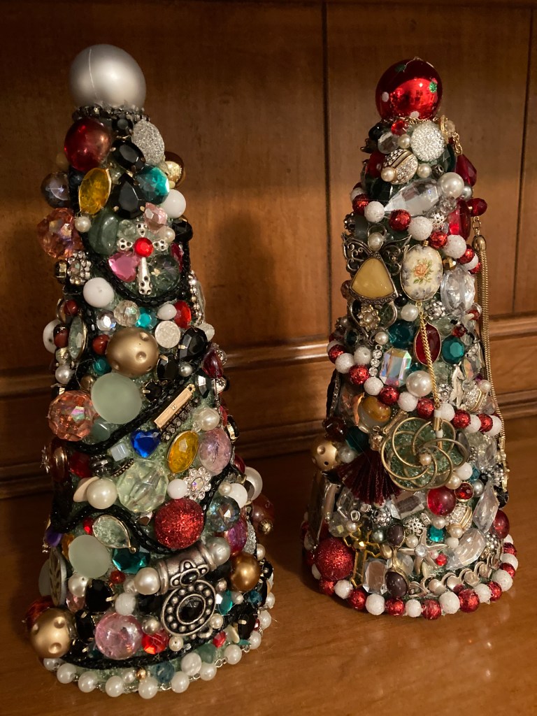 My wife loves to make attractive trees for friends and family members. She purchases cone-shaped Styrofoam trees and decorates them with costume jewelry. She uses a hot-glue gun to apply adhesive to the tree and arranges the jewelry in a variety of patterns.